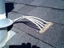 This was high on a townhouse roof where 4 holes were drilled through the shingles and roof for 4 dish lines. Though caulk was used, this is just not a good practice. Here, it would have been so easy to just lift up the vent stack flashing from the lower edge of the vent, shown to the left in this picture, and slide the 4 cables into the attic and then tap the flashing nails back down and caulk the nail heads. As you can see the vent is only 10 inches away.