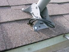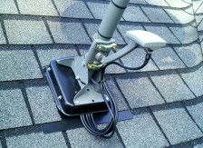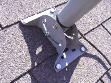 < This is what can happen to a Dish Network Super Dish if the center 5th hole in the mount foot does not have a lag bolt that goes directly into a rafter. Here, the dish lost the signal after a couple of months when the lag bolts slowly pulled out of the roofs plywood decking and finally fell over. We re-mounted this front heavy dish correctly. We use optional side supports when we install this type of dish.