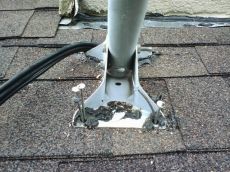 We don't see this too often. Here, the installer used no caulk or sealant under the mount foot or lag screws...none. It takes a couple of years for water to work into the screws threads and start to weaken and rot the roof board. We have seen some screws pull right out of the roof due to rot. We always use a sealant under and on top of the lag screws as many other installers always do!
