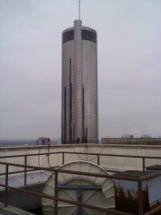 < Westin Peachtree Plaza Hotel downtown Atlanta Dish and Antenna farm atop this 75- story hotel. Once the tallest hotel in the world. There is also a local TV transmission antenna in the center. We performed P/M on the 1.8m dish on the lower right. What a view!