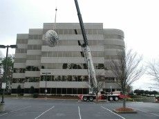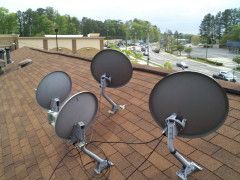 < This was a large job at CNN Atlanta for dish removal and dish relocations. There were 14 dishes atop CNN, now there are 5. They plan to build a steel load frame to support the weight of the many dishes. So we had to remove all but 5 of the dishes and relocate a few others out of the construction zone. When the load frame is complete, the dishes will be replaced and mounted on the frame that is designed to support the weight and get them off the roof. The dishes ranged in size from 1 meter to 3.5 meters.