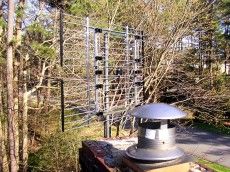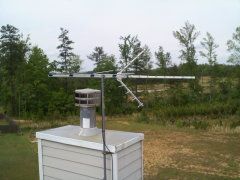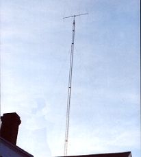 < This isn't a wacky antenna, but a home weather station I installed for a customer. It's atop his 3 story townhomes chimney on a 5 ft. mast, for clear and accurate weather readings. This monitors/logs wind speed, temperature, pressure & rain. Its data is sent wireless to an indoor station. The owner then is able to stream its live data readings on the web. CLICK THE PHOTO TO GO TO THIS SATIONS SITE. He couldn't find anyone else to install it.