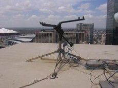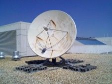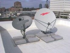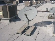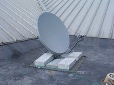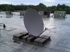 This is our installation at ComCast Sports Net Atlanta. This is a 1.8 meter composite dish on what is called a shiskabob mount. Steel rods run through block in a large square shape to secure the dish mount and add weight. This, like many large roof installations, required a crane to lift the unassembled dish and block to the roof.