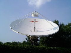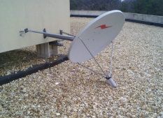 < This is a large 1.2 meter Ku-band dish we installed atop a church in Atlanta. This dish system is in preparation for a national summit durring the summer. Hundreds of churches across America have installed these systems for the summit. This one is mounted on a tripod mount. This dish is somewhat flimsy for its size and is hard to peak on the satellite.