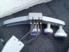 < This is an install we did of an MS-85 multiple LNB dish from Eye-in-the-Sky. You can put up to 6 LNB's on the support arm, for signals from 6 satellites. These LNB's are connected to a 4 port DiSEqC switch. The receiver controls the switch that switches to the LNB for the associated channels and satellite. This provides much faster channel switching than an HH-Motor but is limited to the satellites it's aligned to.