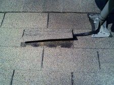 < On this service call, I spotted this shingle that wasn't laying flat. As you can see, the installer needed to get the dish cable into the attic, so he lifted up the shingle and drilled a 3/4" hole and stuck the cable through into the attic and let the loose shingle fall back. There was no caulk in the hole to prevent leaking. What could and probably will happen here, is eventually, the wind will blow the shingle back and water will enter the large un-caulked hole into the attic and ceiling below.