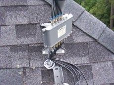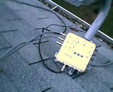 < This is a DirecTV WB68 4x8 multi-switch that the installer just left hanging from the 4 LNB cables under the AU-9 dish. Water will eventually run down the lines and into the connections. The switch should be mounted with the connections horizontally, it is an outdoor switch when mounted correctly. Also, the optional support arm you can see below the switch only has one lag bolt in its mount into the roof as well as being oriented wrong...