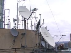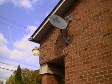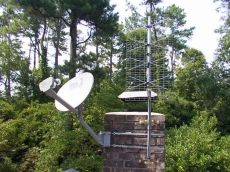 < Evangelistic Satellite TV System for ATN, ACN, 3ABN, LLBN. 76cm dish on roof hidden by chimney. AMC4. There is a new dish for this service that now picks up two satellites for many more channels.