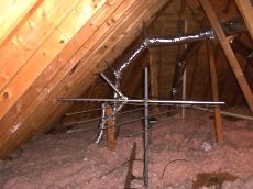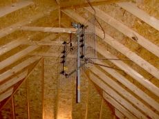 < Sometimes the antenna can be mounted in an attic. Attic installations can reduce the antenna's signal by as much as 50%, and many times they just don't perform well. A pre-amp may help. Attic installations work best close-in to Atlanta and inside 285. This installation worked well with an amplifier added. This is a small Vhf/Uhf antenna, the larger the better for an attic installation. You can spend hours trying to get an attic antenna pointed and working due to space.