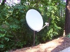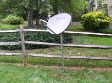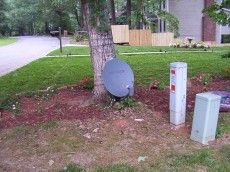 < Mounting the dish on a tree is not really recommended. It can damage the tree and may require yearly dish readjustment. It could be done for the short term as a last resort and only down low on the tree as here. If higher than a couple of feet, the dish can lose the signal as the tree grows, requiring realignment. Some trees twist as they grow. We have seen these at apartments where the owner will move in a year. We installed a new dish on the home of this customer and removed this.
