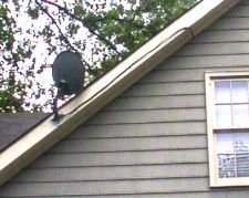 < This DirecTV dish was mounted on the roof soffet edge sideways. Note that the dish mount foot is not vertical, but placed so all 4 bolt holes line up on the board. This causes the mount pole arm to stick out from the mount instead of up, so the dish is laying almost on it's SIDE, hard to see from this angle. The cable could have been run under the edge to hide it. Circular polarization will permit this unconventional mounting position.