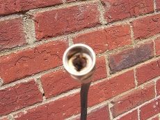 This is a wacky install of a TV yagi antenna fixed is vertically to a dead power service conduit. Of course, an antenna should not have been installed this way. Must have been a do-it-yourself job. It wouldn't have taken much to do the job right and surely make for better TV reception...