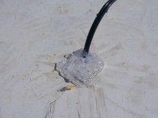 This is a photo of a dual satellite cable going through a hole that the installer had drilled right through the very expensive sealed Neoprene (rubber) roof atop this shopping center building. That glob is silicone caulk squirted around the hole he made. Penetrating any Neoprene roof is a BIG NO! NO! If the installer had just followed other cables he could have gotten them into the building from under the A/C unit, like other cables there. The Bldg. owner will flip out if he sees this.