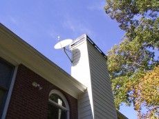 Another chimney mount. When mounting on a siding chimney you must secure the mast mount foot on the corner board. If mounted on the siding planks it will eventually pull out and fall off. There are no studs to secure to, in the center, behind the siding. If I needed greater height on this install I would have mounted the mast up to place the antenna above the top of the chimney. We always use an antenna that has higher gain then is needed to be assured of a trouble free picture.