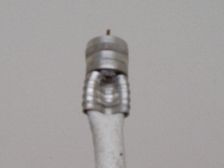 < This is a cable connector where the tech or contractor used an electrical connector crimper instead of the correct compression tool designed for an RG6 connector. We found every connection in the house shorted due the connector crushing the cable and shorting the center wire to the outer shield of the cable. The right tools can make a difference...