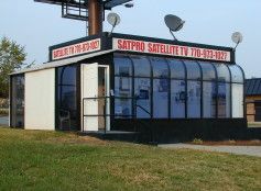 < This was SATPRO's unique East Cobb County location a few years ago. It was on a very busy intersection corner. We were able to demo Dish Network and DirecTV to our customers. Drivers could see the 2 TV's we had on 24/7 through the full glass walls while waiting at the light from the road in front of this building. Our signage on top was lit from behind at night.