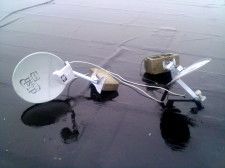 On this call, the Direcway subscriber lost his business satellite internet connection. On the roof I found that the dish and mount laying on its side. It had been blown over by a wind gust. The installer used a roof mount that required 100 lbs or more of weight blocks like I added to the mount in the picture. But he used the small stack of bricks {15 lbs} instead of the required weight. Bricks don't fit on the mount!